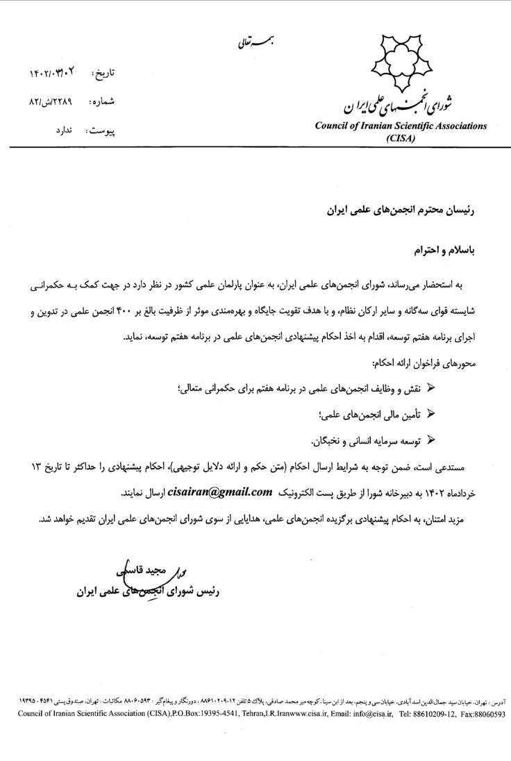 ضمن توجه به شرایط ارسال احکام(متن حکم و ارائه دلایل توجیهی)، احکام پیشنهادی را حداکثر تا تاریخ 12 خرداد ماه 1402 بهروابط عمومی انجمن ارسال نمایند.